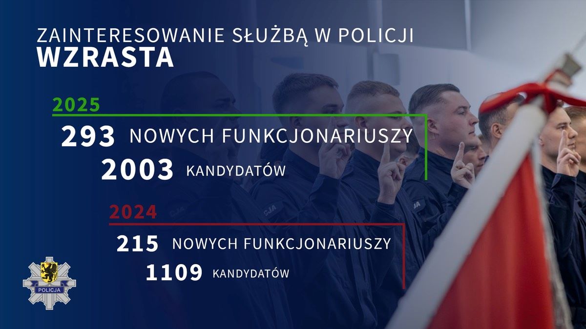 Od początku 2025 roku do końca września złożono 2003 aplikacje o przyjęcie do służby w Policji. Dla porównania – w analogicznym okresie 2024 roku wpłynęło 1109 aplikacji, a w 2023 roku – 693.