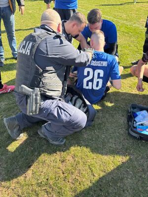 Dzielnicowy z Komendy Powiatowej Policji w Sztumie zauważył bardzo groźną sytuację. Na ich oczach jeden z piłkarzy niefortunnie upadł, doznając obrażeń ręki. Funkcjonariusz natychmiast zaczął udzielać poszkodowanemu pierwszej pomocy przedmedycznej. Dzięki jego profesjonalizmowi mężczyzna bardzo szybko trafił pod opiekę ratowników medycznych, którzy przewieźli go do szpitala.